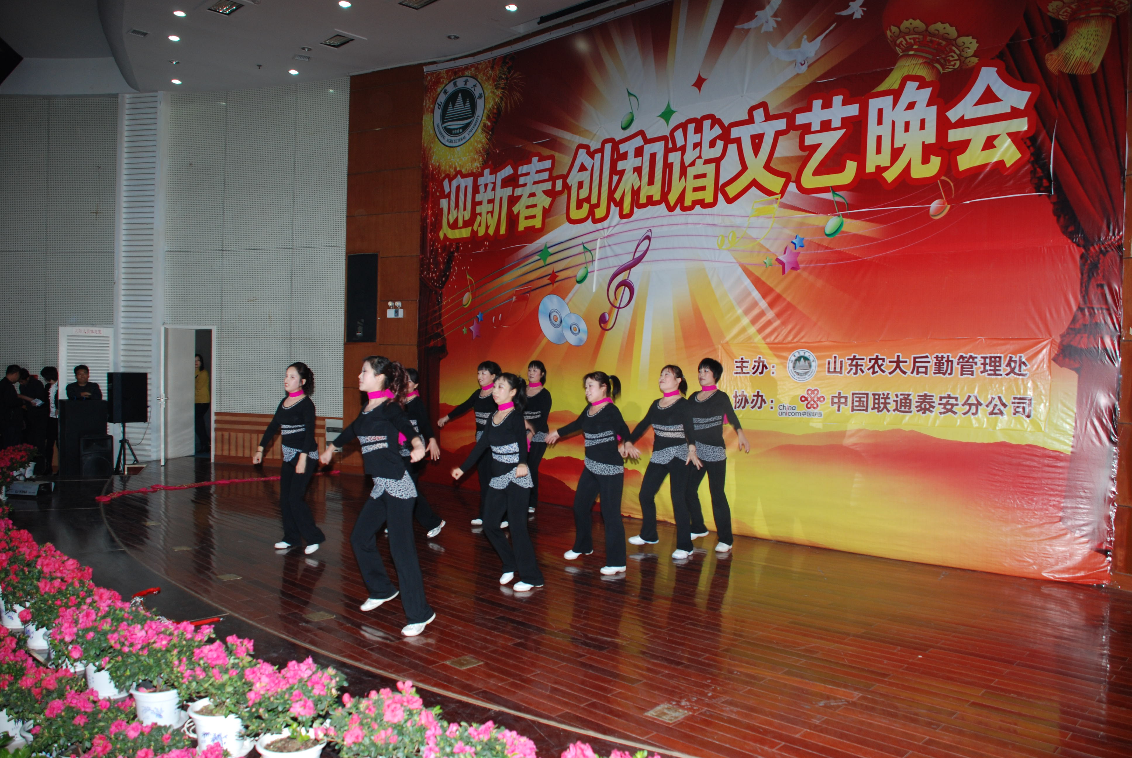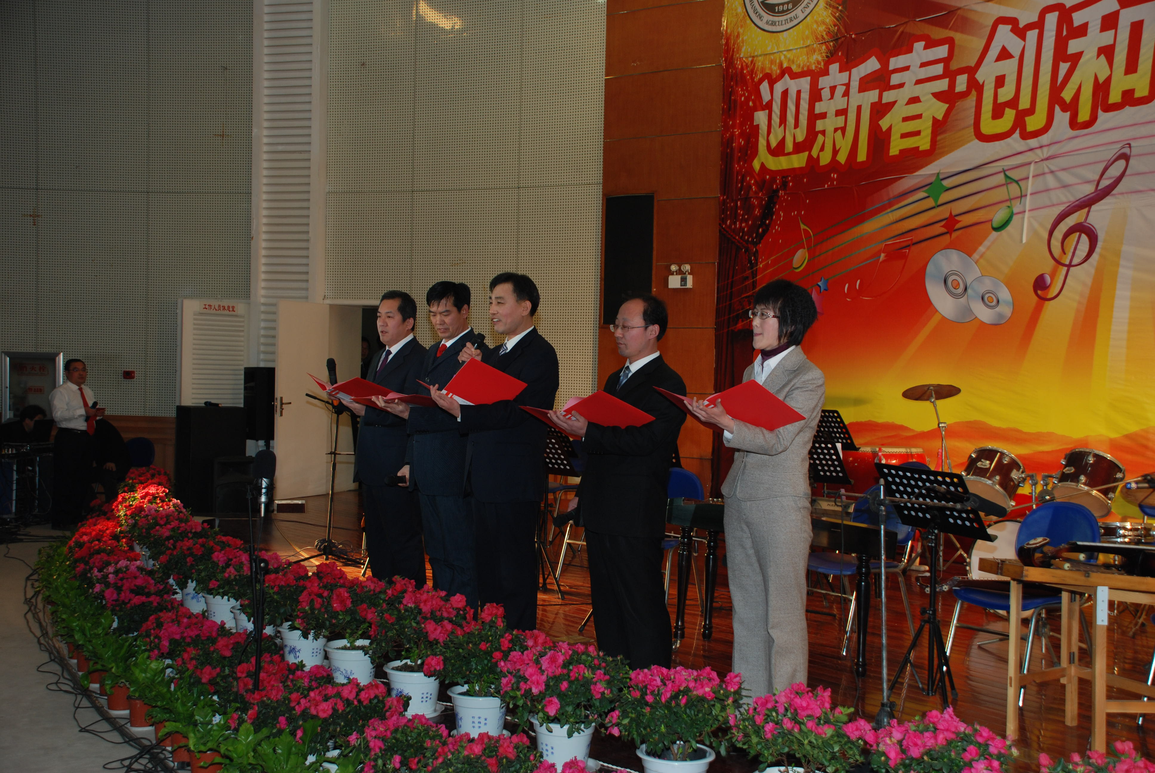 1月24日晚,文理大楼学术报告厅鲜花盛开,华灯璀灿,后勤处举办的“迎新春创和谐文艺晚会”在此举行,学校领导苗仲华、周林、董新胜、朱莉,学校离退休老领导刘洪森、吴绍麟,学校有关部门负责人,与后勤职工同庆佳节、共迎新春。