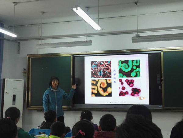 刘丽英重点讲解了微生物与人类的关系,她从微生物与食品,微生物与疾病,微生物与医药,微生物与其他等四个方面入手,让学生知道了微生物有细菌、放线菌、真菌、病毒等种类,懂得了微生物生长旺、繁殖快、适应强、易变异的特点,了解了微生物在自然界物质循环中作用,在空气与水净化,污水处理工农业中的功能,以及对生命科学的贡献。刘丽英运用了大量的图片和视频,让微生物活灵活现的展现在大家的面前,同时还让学生知道了酸奶,馒头,酸菜,食醋,酱油,酒类都与微生物关系密切。
