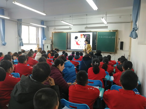 为五年级学生授课的是泰安师范附属学校的王书茵老师,她是泰安市的功勋教师,他授课的内容是《自己的花是让别人看的》。她讲课如春风如细雨,由浅入深,层层渗透,让学生们学起来很轻松,很有兴趣;她讲课如山泉如小溪,流畅自然,浸润透彻,让学生们收获匪浅,受益良多。整堂课文化气息浓郁,充满了文学的美感,师生们都赞不绝口,连连点头。