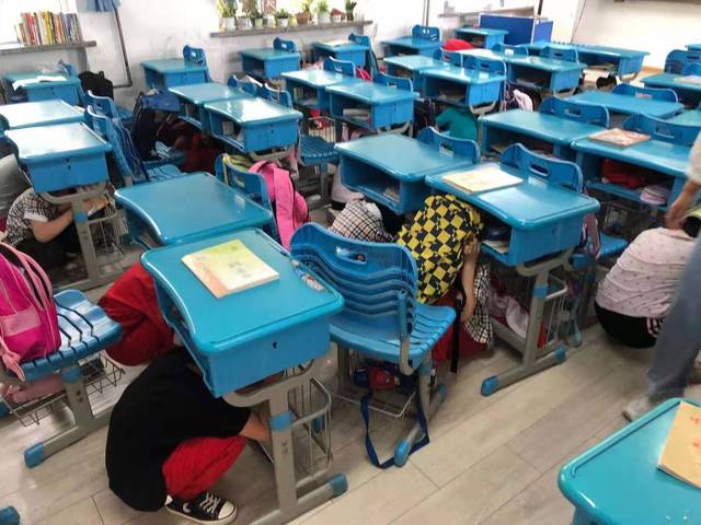 演练开始,正在上课的师生听到“地震警报”信号,上课教师立即停止授课,立即告知学生“地震了,不要慌”,并指挥学生迅速抱头、闭眼,蜷曲身体,降低身体重心,在各自的课桌下躲避。强震已过,信号员发出“紧急疏散”信号。教师指挥学生双手保护头部、低身前行,迅速撤离教室按照预定的疏散路线,迅速到达事先指定的地点整队。全校10个班,400余名师生全部安全疏散到指定区域,用时仅为1分27秒 ,达到了“安全快速,镇定从容,整体有序”的预期要求。