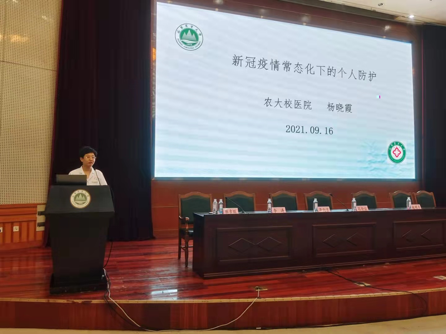 9月16日下午,新冠疫情常态化个人防护专题讲座在文理大楼学术报告厅举行。校医院院长杨晓霞应邀为农学院2021级全体研究生讲授疫情防控课。