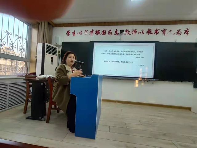 尹红霞以卡耐基的一句名言“一切的成就,一切的财富,都始于健康的心理。”来阐明具备健康心理的重要性。她详细讲解了心理咨询和心理治疗的相关知识,讲授了教师面临的来自社会和职业的压力,提醒教师情绪管理的策略。