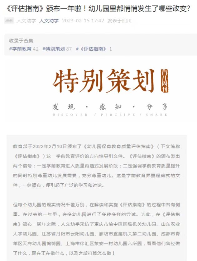 “人文幼学”是一个育儿周刊学前教育专业平台,主要关注幼儿家园共育、家长教育。日前,在教育部《幼儿园保育教育质量评估指南》颁布一周年之际,“人文幼学”采访调研了全国六所幼儿园。其中,专题报道了威廉希尔官网幼儿园在品德启蒙、师幼互动和专业发展等方面的典型经验和做法。