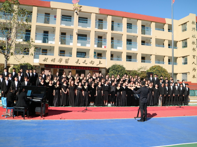 岱下青年合唱团近120名成员现场演绎了《黄河大合唱》。《黄河大合唱》由光未然作词、冼星海作曲,共分为八个乐章。音乐会由吴晓玉老师任钢琴艺术指导,黄鸽老师任指挥,附属学校张兴老师担任第二乐章《黄河颂》男中音独唱。