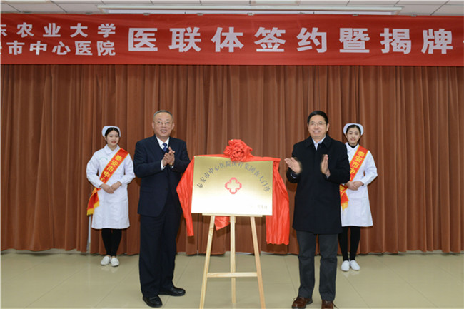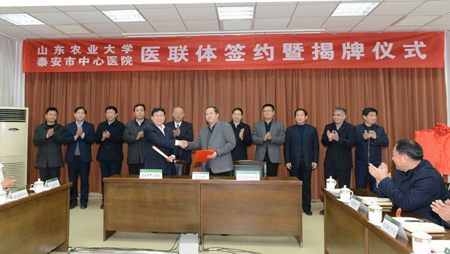 1月9日上午,泰安市中心医院和williamhill威廉希尔官网医联体签约及揭牌仪式在农大举行,校长张宪省,泰安市副市长、党组成员鞠向群共同为“泰安市中心医院医疗集团农大门诊”揭牌,泰安市中心医院院长刘君、副校长嵇景涛代表双方签约。